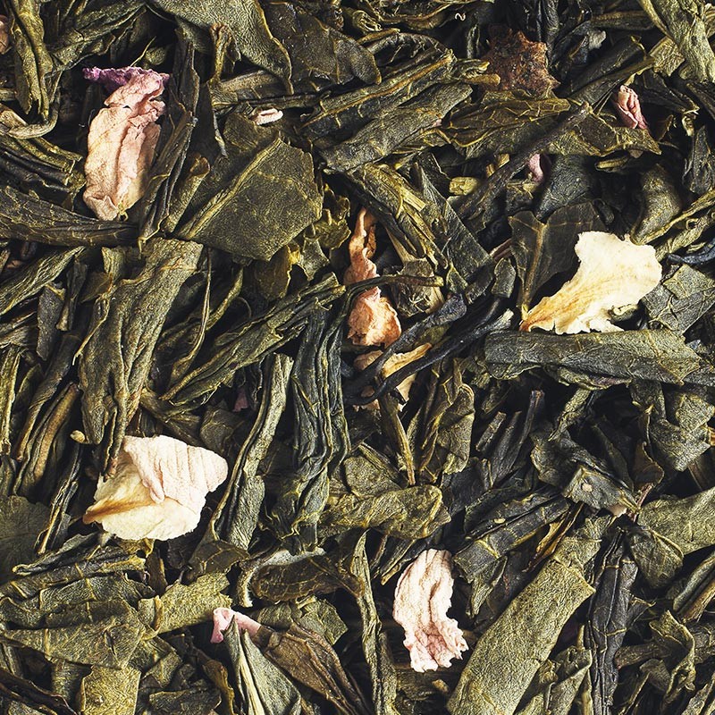 Thé vert China Sencha*, pétales de rose*, arôme naturel de framboise, arôme naturel de fraise, arôme naturel de rose. *Issu de l‘agriculture biologiqueDescription