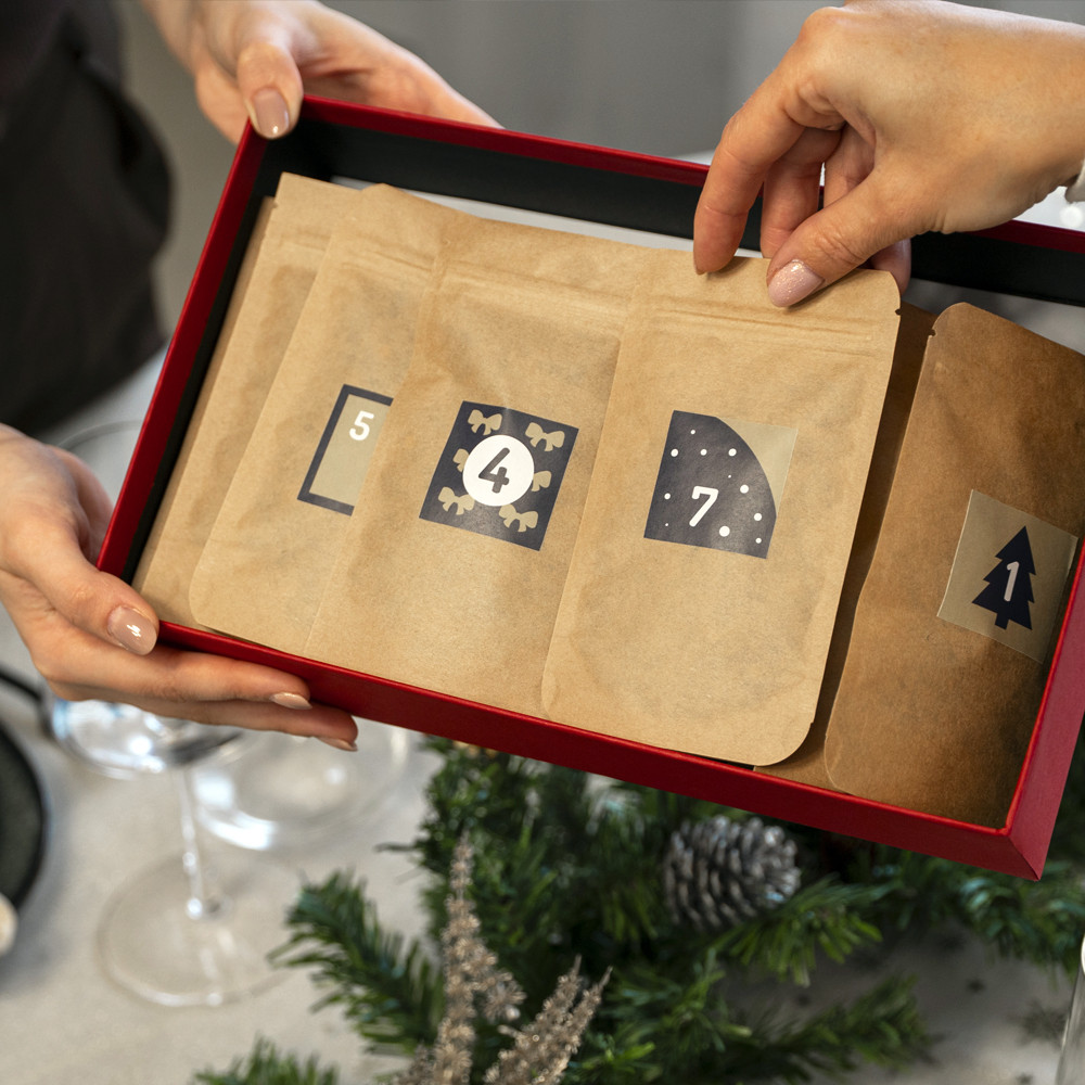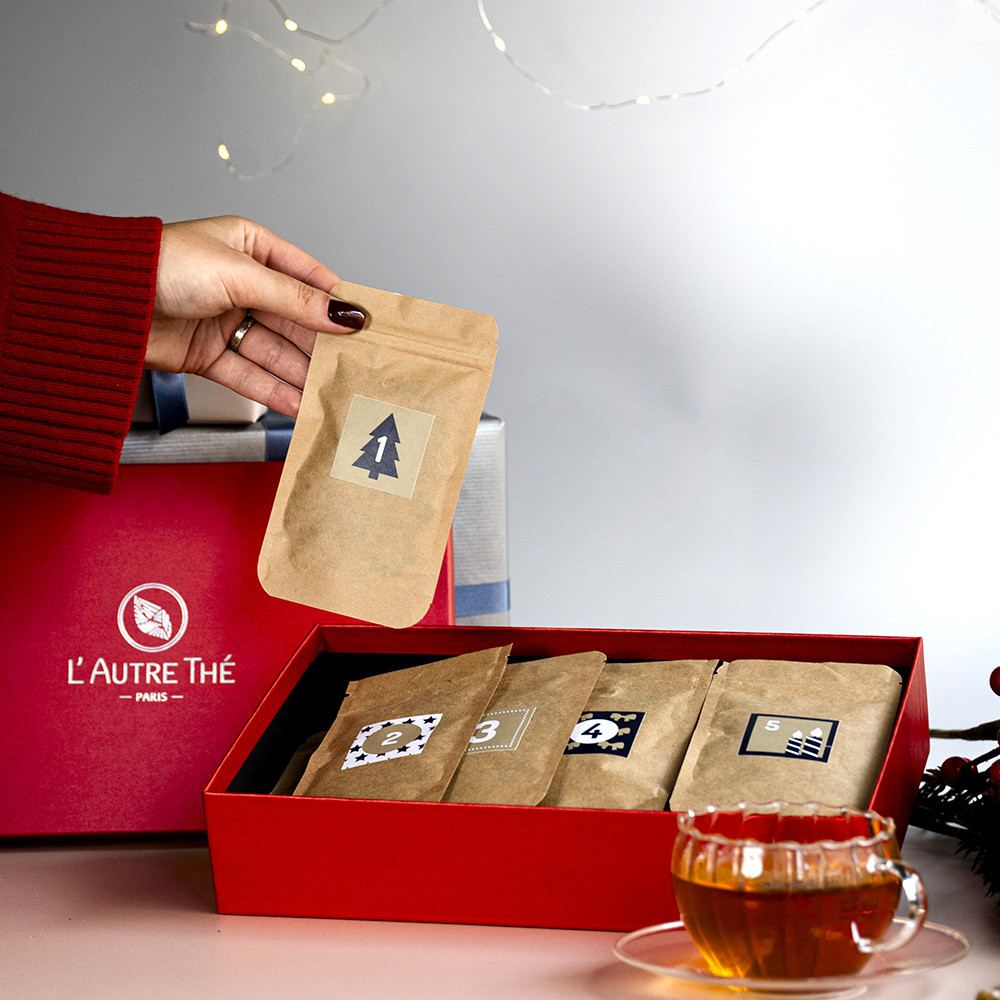 Comme l'année précédente, nous avons accentué la surprise : les sachets sont juste numérotés, et le détail du contenu est disponible pour ceux qui le souhaitent au fond du coffret. Le coffret contient également un guide des paramètres d'infusion, pour préparer chaque sachet comme il se doit sans révéler pour autant le nom du thé dont il s'agit. L'occasion, pourquoi pas, d'exercer ses papilles en faisant des dégustations à l'aveugle, pour des moments ludiques ! Combien de thés saurez-vous reconnaître?