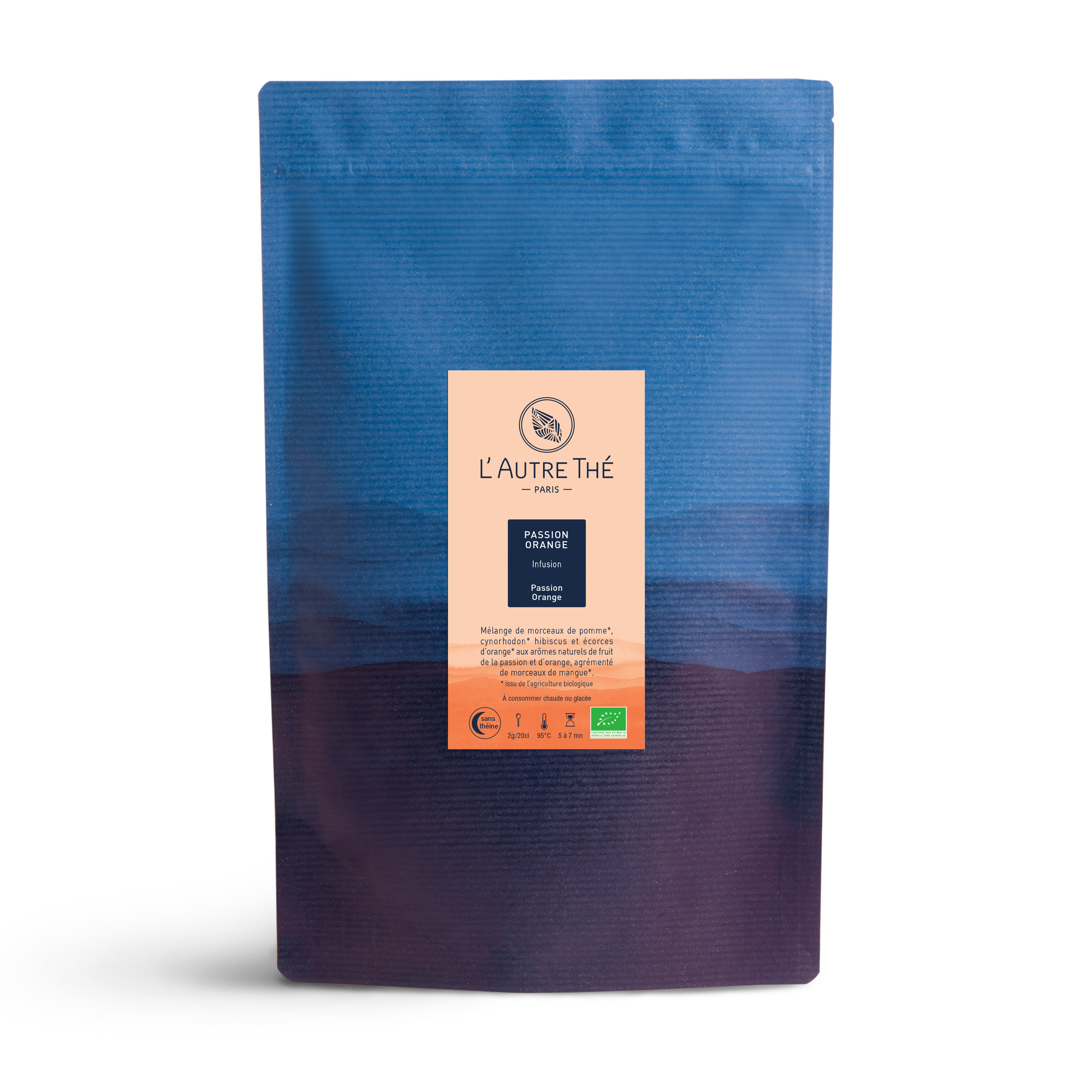 Pomme*, cynorrhodon*, hibiscus*, écorces d'orange*, arôme naturel d'orange, arôme naturel de fruit de la passion, morceaux de mangue*. *Issu de l‘agriculture biologiqueDescription