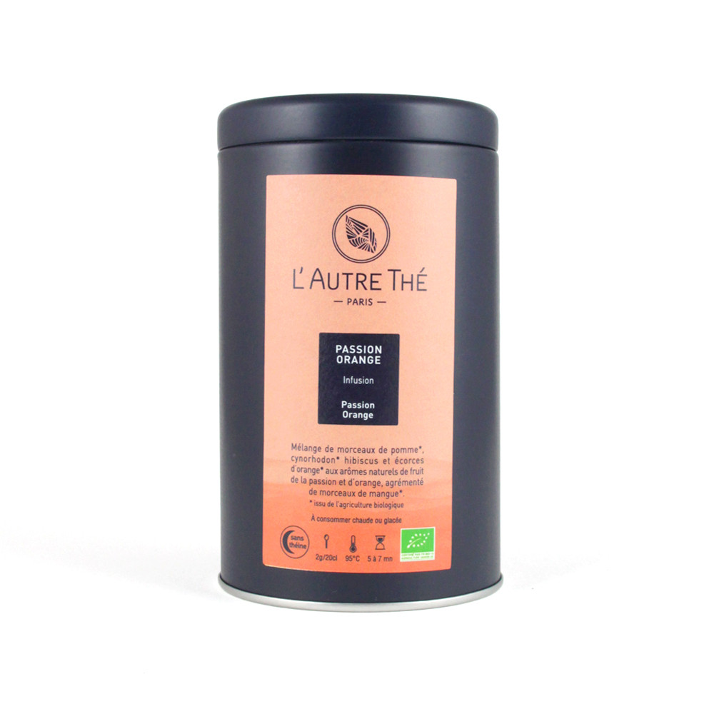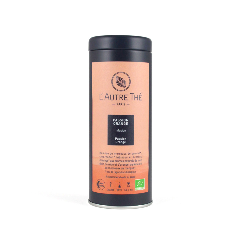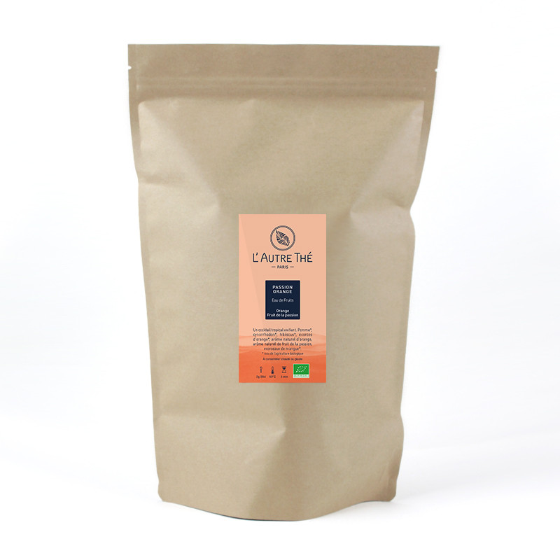Cette infusion bio "Passion Orange" est une eau de fruits (c'est-à-dire un mélange de fleurs d'hibiscus, de morceaux de fruits et de pétales de fleurs) à base de morceaux de pommes, de papaye, d'écorces d'orange. Elle peut se boire chaude ou glacée. Une saveur fruitée et gourmande.