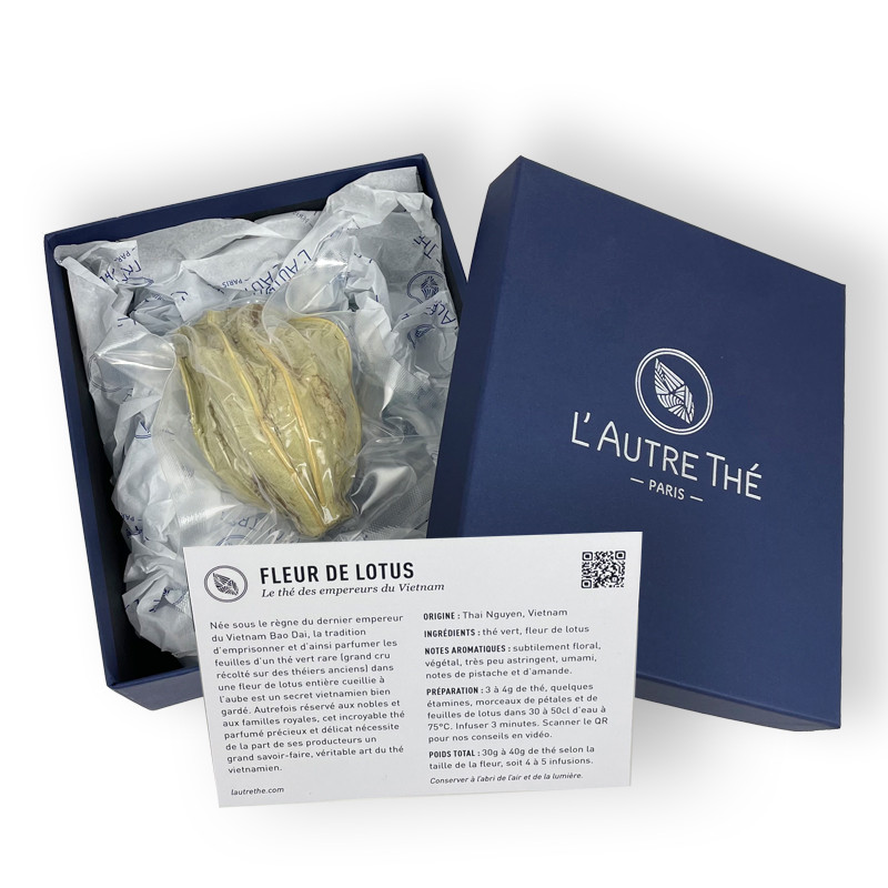 Née sous le règne du dernier empereur du Vietnam Bao Dai, la tradition d’emprisonner et d’ainsi parfumer les feuilles d’un thé rare (grand cru récolté sur des théiers anciens) dans une fleur de lotus entière cueillie à l’aube est un secret vietnamien bien gardé. Autrefois réservé aux nobles et aux familles royales, cet incroyable thé parfumé précieux et délicat nécessite de la part de ses producteurs un grand savoir-faire, véritable art du thé vietnamien.