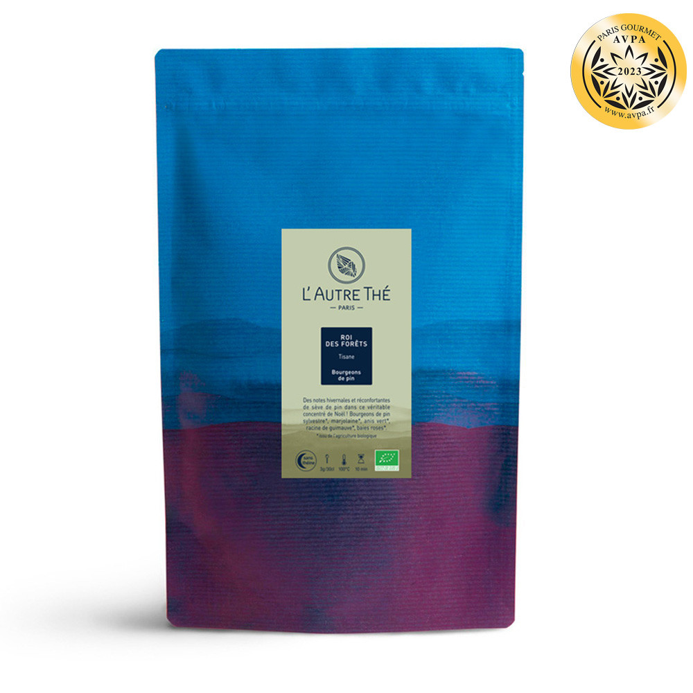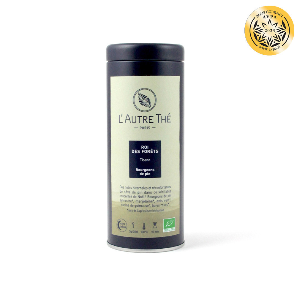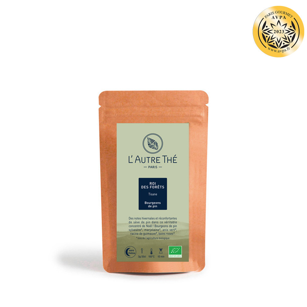 En créant cette tisane unique, Arnaud Dhenin, notre nez, souhaitait capturer dans un breuvage l'ambiance si particulière d'un retour au chalet après une longue promenade dans une forêt de sapins enneigés. Roi des Forêts est un concentré d'hiver, à la fois frais, vivifiant et boisé, où les notes de résine de pin sont soulignées d'une pointe anisée et de la légère sucrosité de la guimauve. Les saveurs végétales apaisent et réchauffent, les plantes s'expriment sans aucun arôme ajouté.