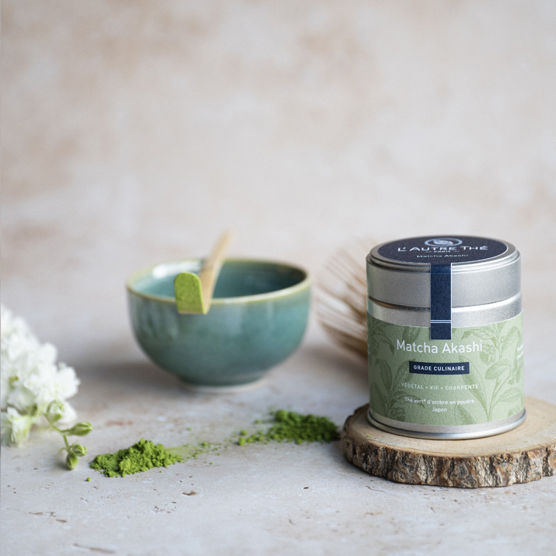Ce thé bio Matcha Akashi est un thé vert japonais réduit en poudre. Son parfum est végétal frais, le Matcha Akashi est plus vif et plus astringent que notre Matcha premium Fujitsubo, on le destinera plutôt à l'entrainement (pour s'exercer sur un Matcha moins onéreux) ou à la pâtisserie.