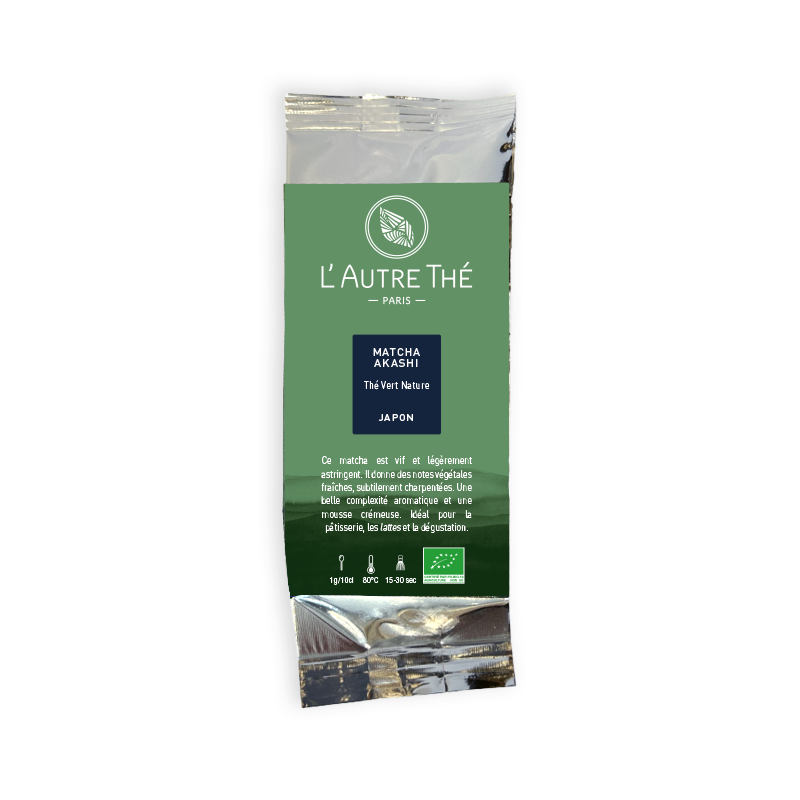 Ce thé bio matcha Akashi est un thé vert japonais réduit en poudre. Son parfum est végétal frais, le Matcha Akashi est plus vif et plus astringent que notre Matcha premium Fujitsubo, on le destinera plutôt à l'entrainement (pour s'exercer sur un Matcha moins onéreux) ou à la pâtisserie.
