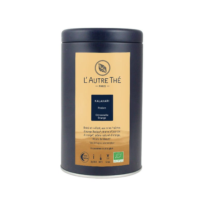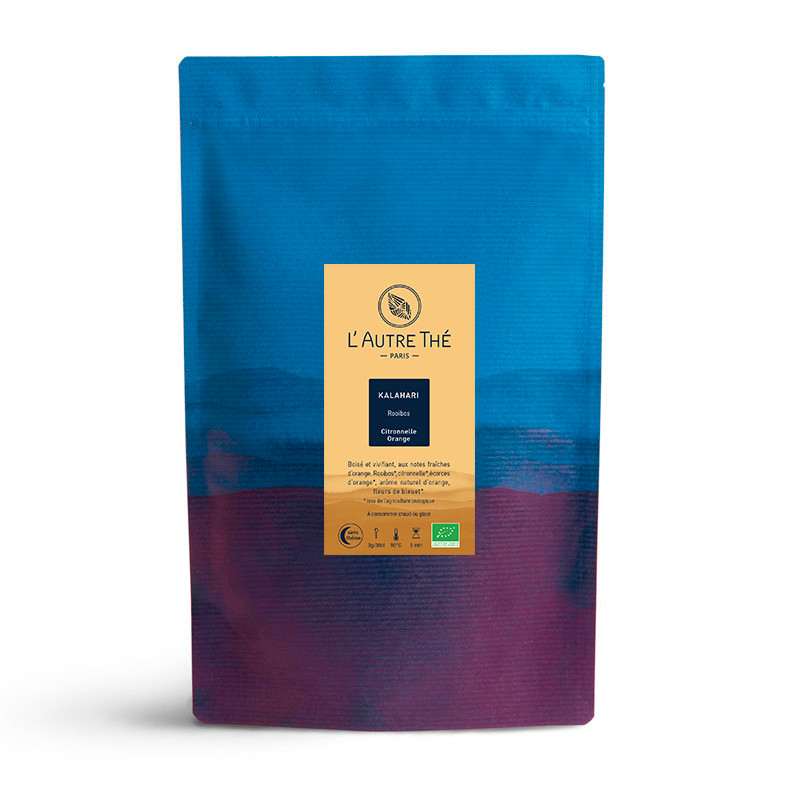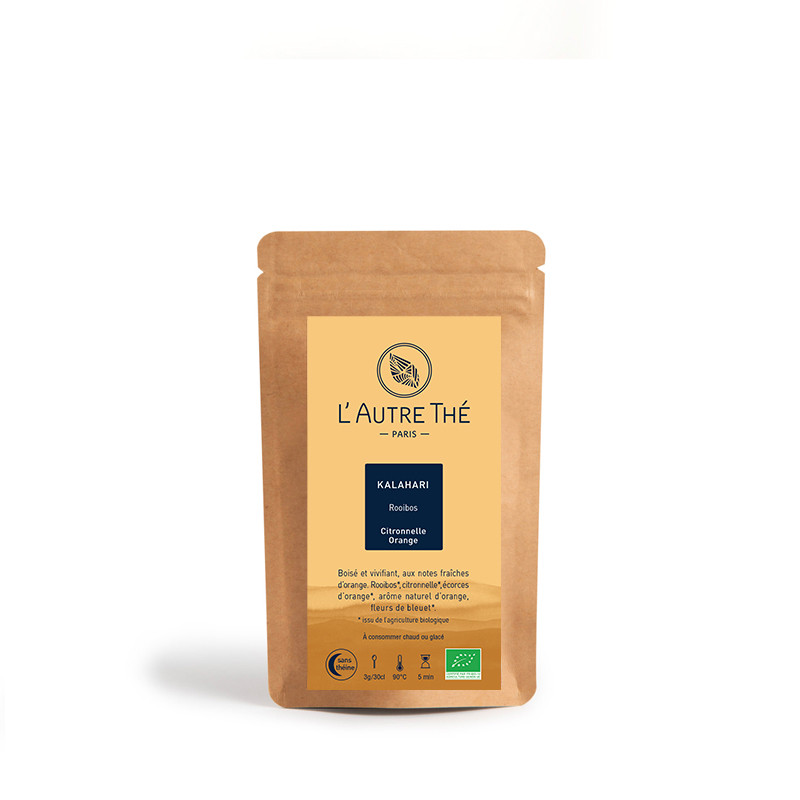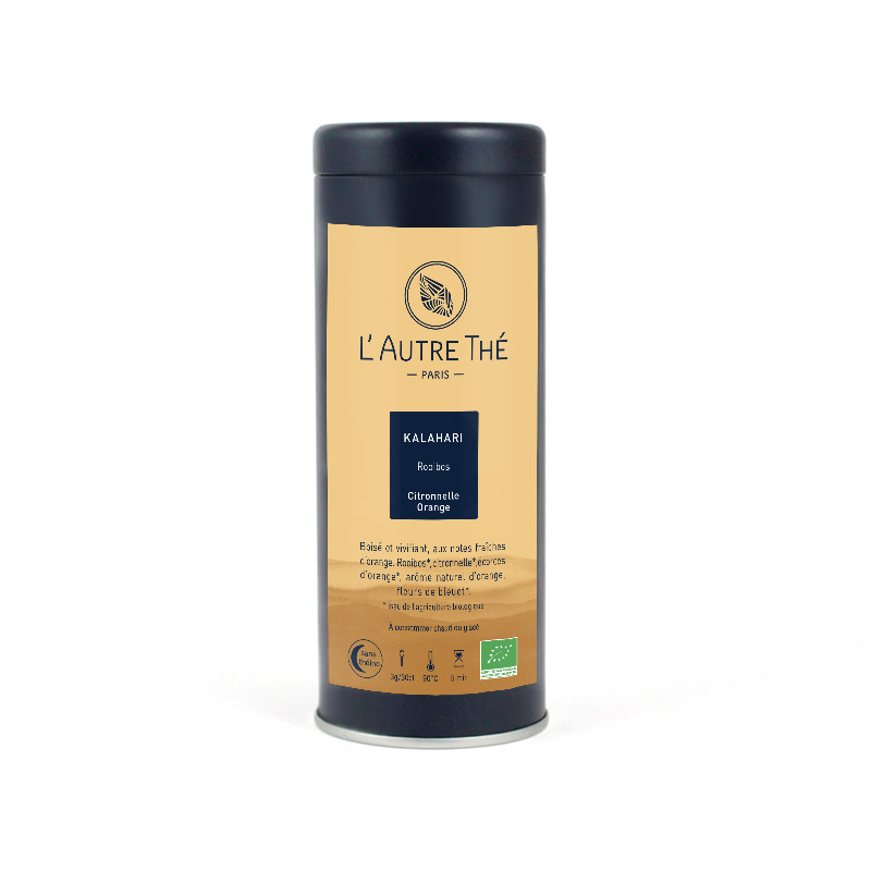 Ce rooibos biologique "Kalahari" offre la saveur subtile et naturelle des agrumes avec une dominante d'orange. Il est accompagné de citronnelle, d'écorces d'orange et de fleurs de bleuet.