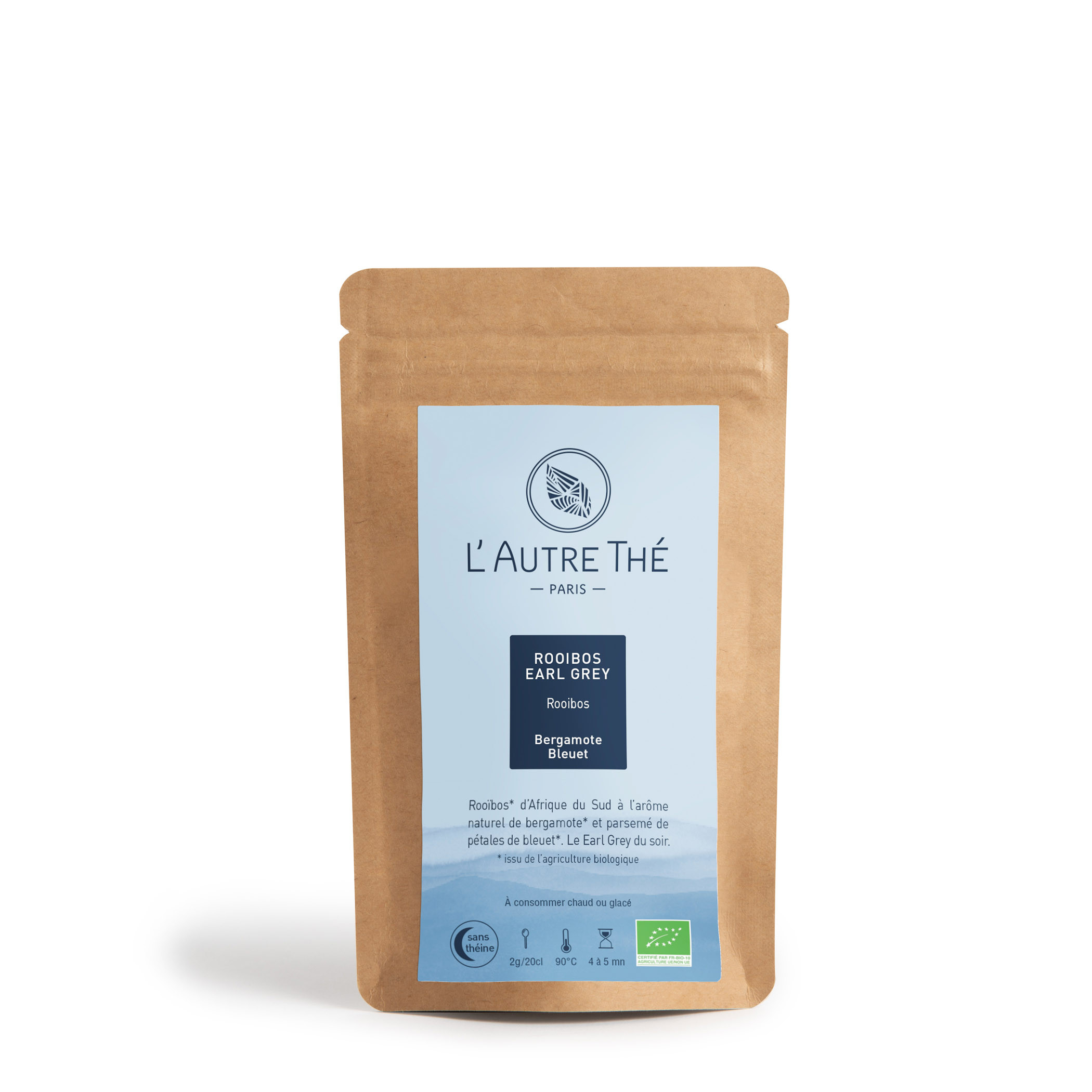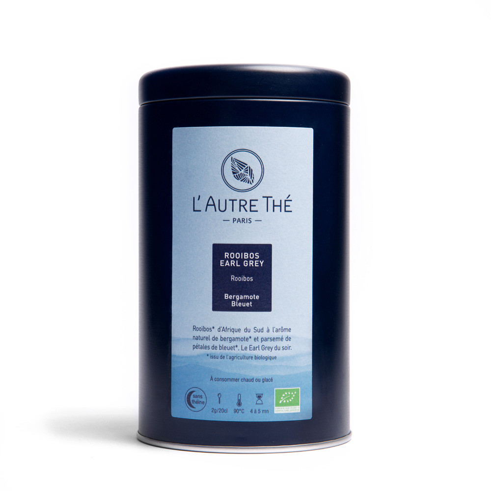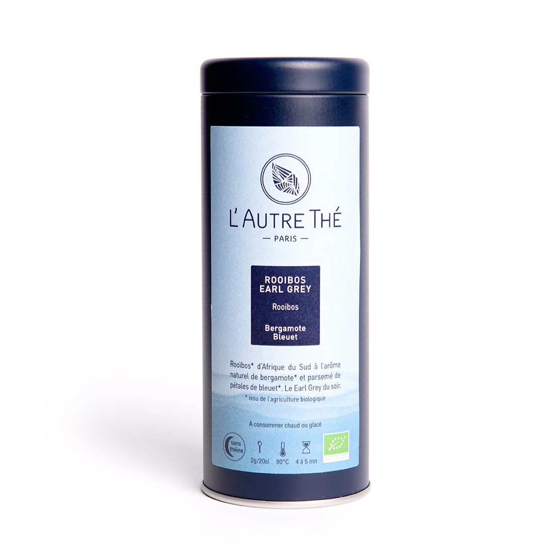 Rooibos*, huile essentielle de bergamote, pétales de bleuet*, arôme naturel de bergamote. *issu de l’agriculture biologique.Description