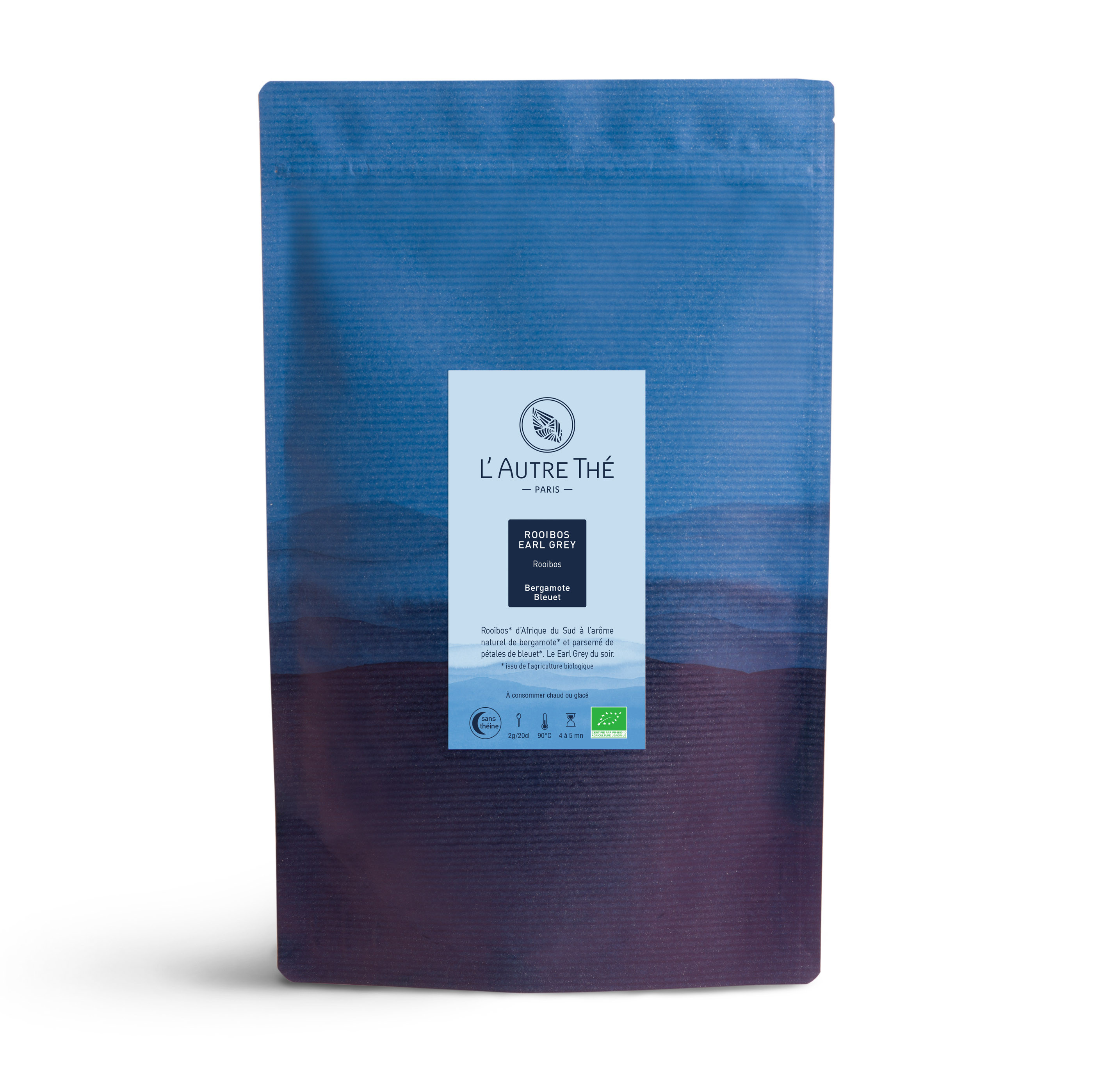 Ce rooibos bio Earl Grey d'Afrique du Sud est parfumé à l'huile essentielle et à l'arôme naturel de bergamote. Il est parsemé de pétales de bleuet.