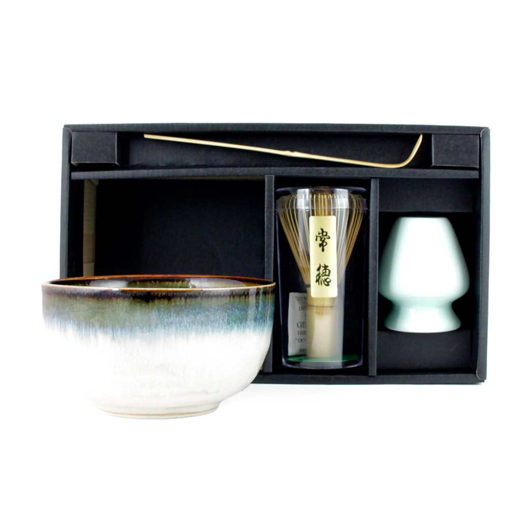 Découvrez notre coffret de préparation spécial Matcha composé d'un bol (chawan), d'un fouet en bambou (chasen), d'un support pour le fouet et d'une cuillère doseuse en bambou (chashaku)