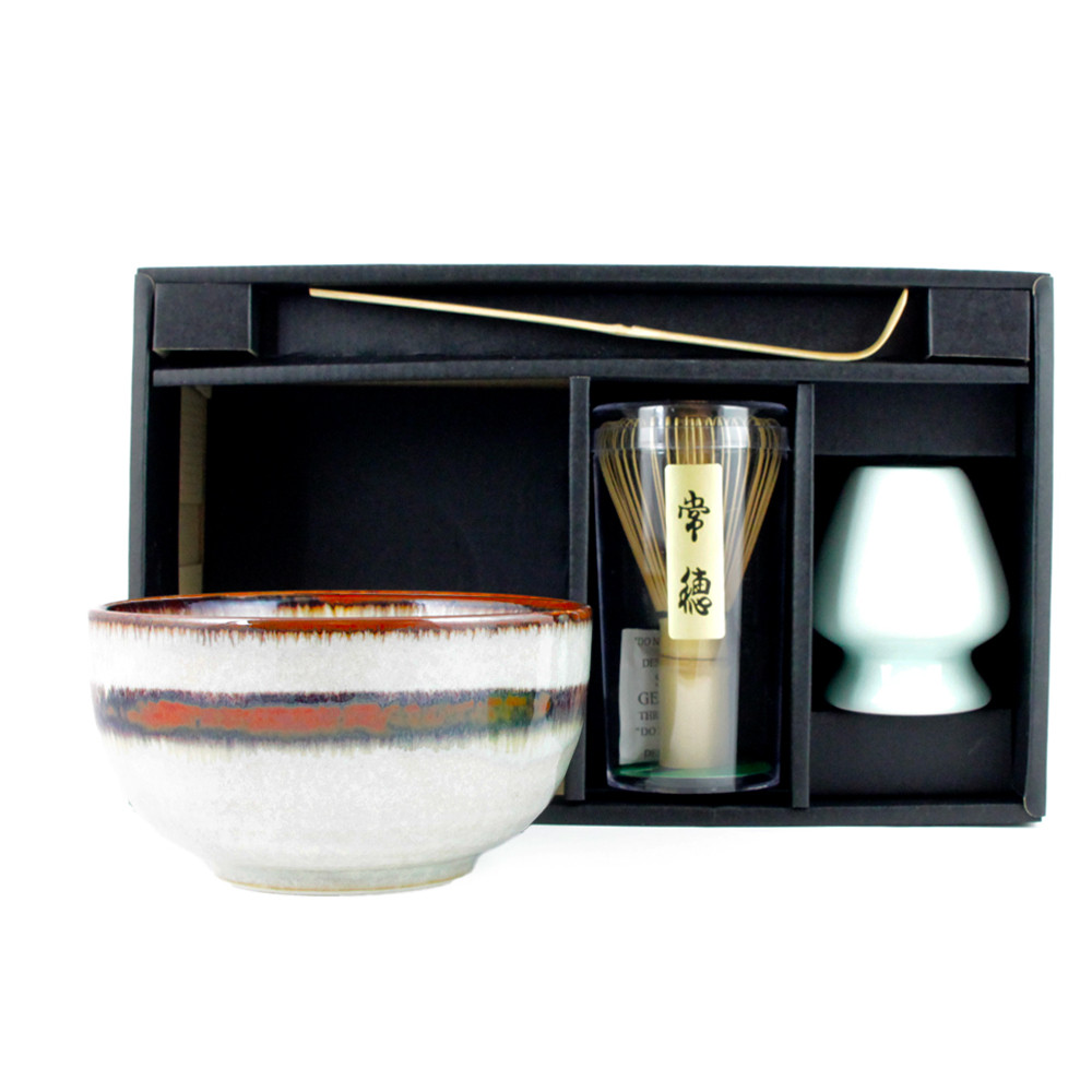 Découvrez notre coffret de préparation spécial Matcha composé d'un bol (chawan), d'un fouet en bambou (chasen), support pour le fouet et d'une cuillère doseuse en bambou (chashaku)