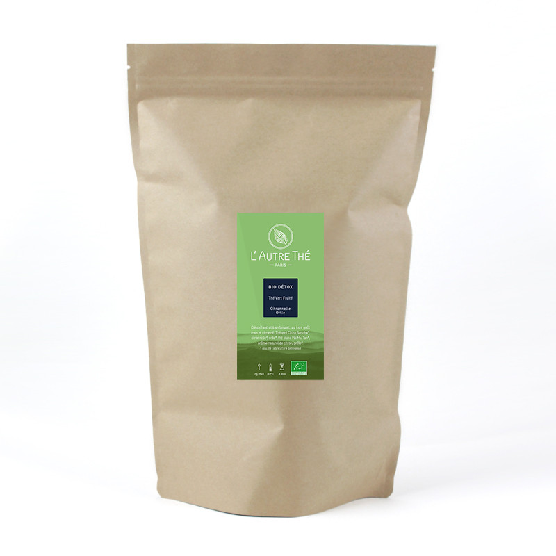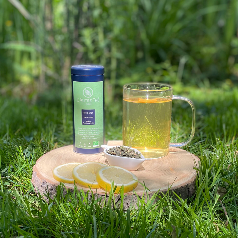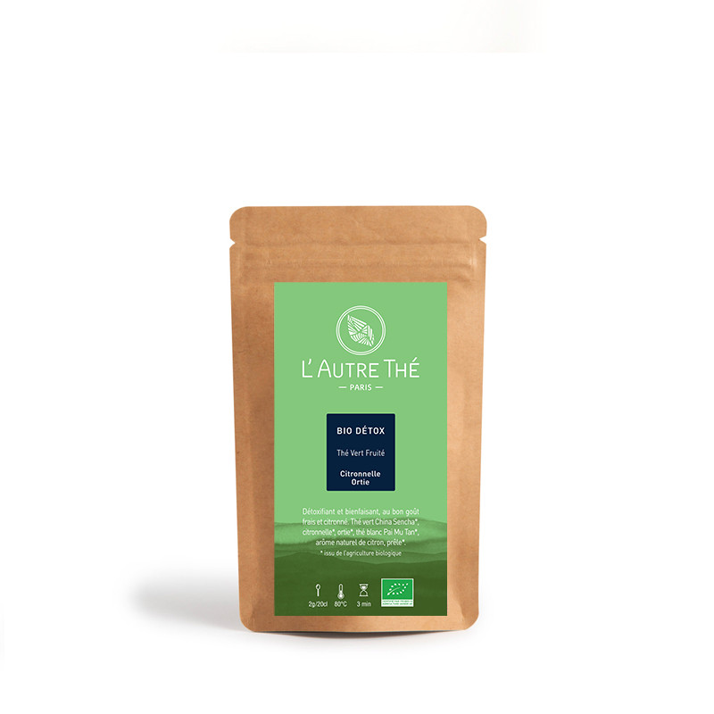 Ce thé bio détox est un mélange de thé vert Sencha, de thé blanc Paï Mu Tan et de prêle, à l'arôme naturel de citron. Il est agrémenté de feuilles d'ortie et de citronnelle.