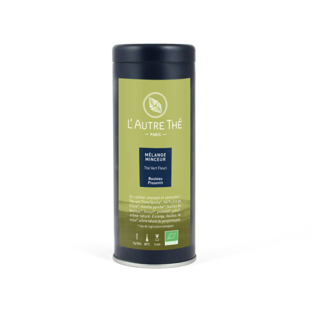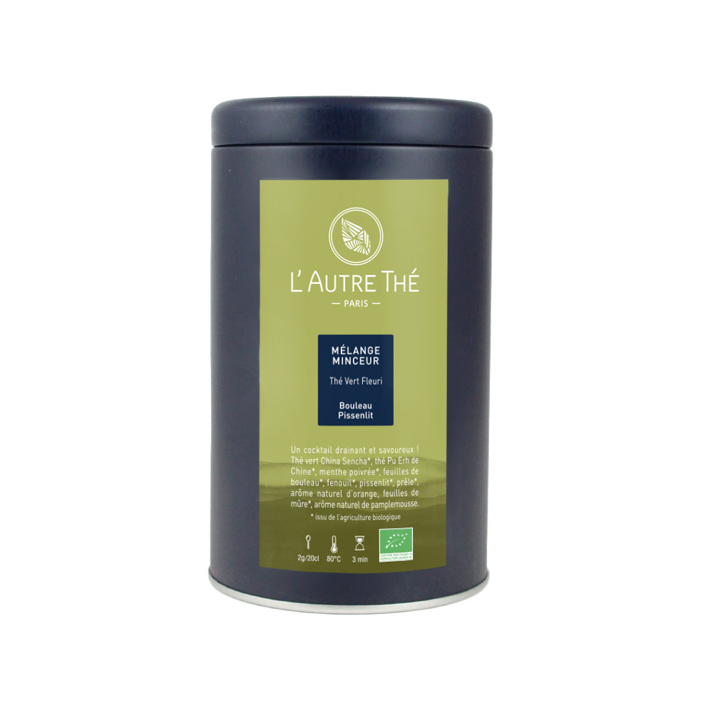 Ce Mélange Minceur BIO est un mélange de thé vert Sencha de Chine et du fameux Pu Erh chinois parfumé aux arômes naturels d'agrumes, accompagné de plantes drainantes : feuille de bouleau et de mûrier, menthe poivrée, pissenlit, fenouil et prêle.