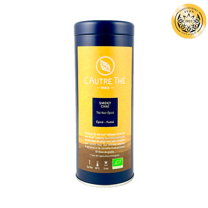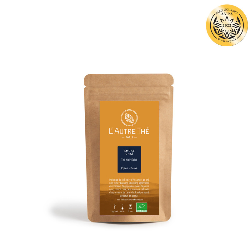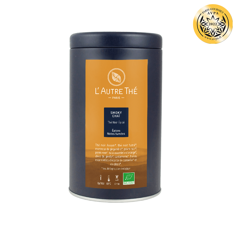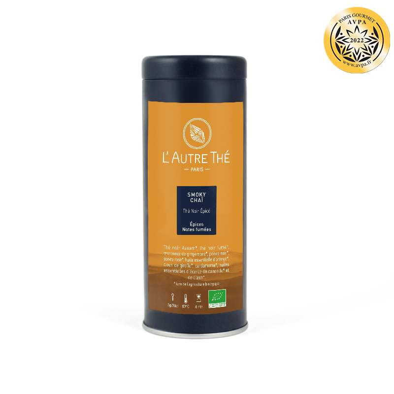 Mélange de thé noir d'Assam (Inde) et de thé noir fumé Lapsang Souchong (Chine) tous deux biologiques, Smoky Chaï est agrémenté d'épices soigneusement choisies et d'une pointe d'agrumes. Un thé dont les notes boisées/fumées évoquent la chaleur d'un feu de cheminée en hiver, le côté réconfortant des épices en plus.