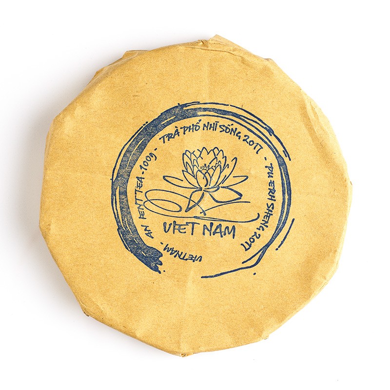 Marqué du sceau de la fleur de lotus, symbole de l'identité vietnamienne, ce thé sombre Sheng (cru) de 2017 est produit par l'ethnie des Dzao dans le Nord du Vietnam au sein de la coopérative Cao Bo. Il s'agit d'une cueillette impériale (une feuille, 1 bourgeon) sur des théiers anciens, travaillée de manière artisanale.
