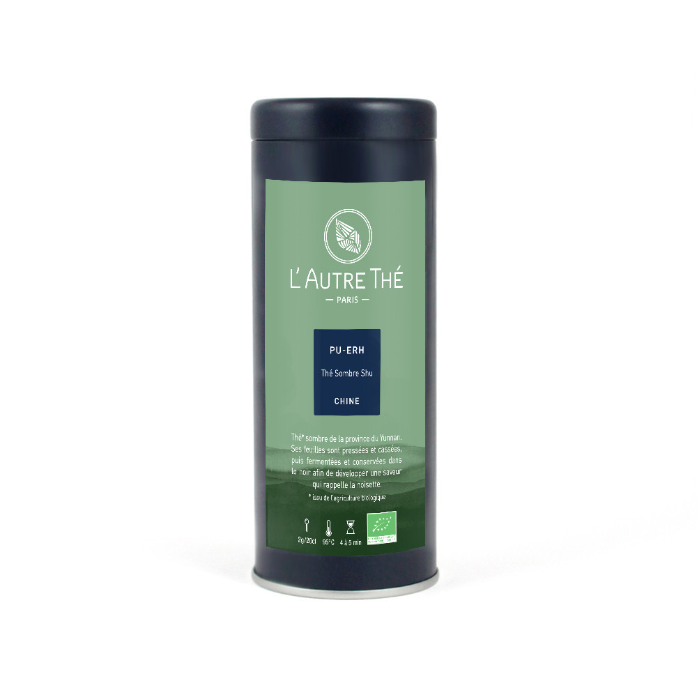 Ce thé bio "Pu Erh" ou "Yunnan Tuocha" provient du sud de la province chinoise du Yunnan. Ses feuilles sont pressées et cassées. On l'appelle thé sombre car il subit une longue fermentation et conservation dans le noir, qui lui donnent une maturation propre au Pu Erh. Le thé bio Pu Erh offre une tasse aromatique terreuse au léger goût de noisette. Connu pour ses propriétés drainantes, on lui attribue de nombreuses vertus, notamment celle de faire baisser le cholestérol.