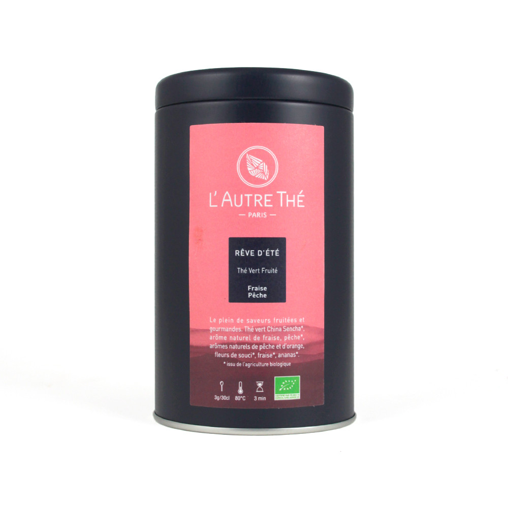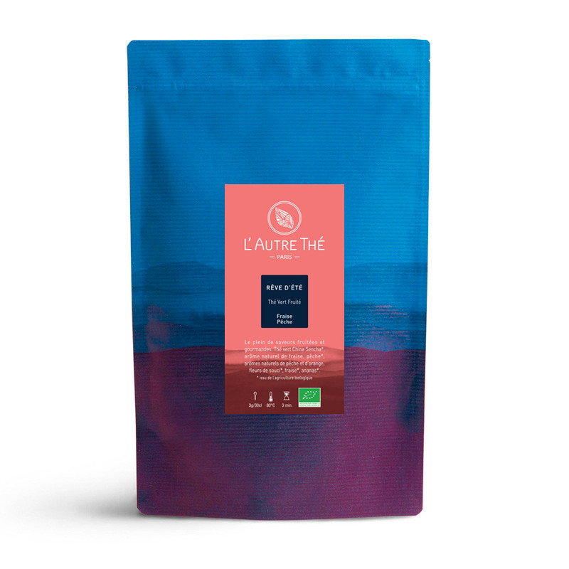 "Rêve d'été" est un thé Sencha de Chine aux arômes naturels de fraise et de pêche. Il est agrémenté de morceaux de pêche, de fraise et d'ananas et parsemé de fleurs de souci.