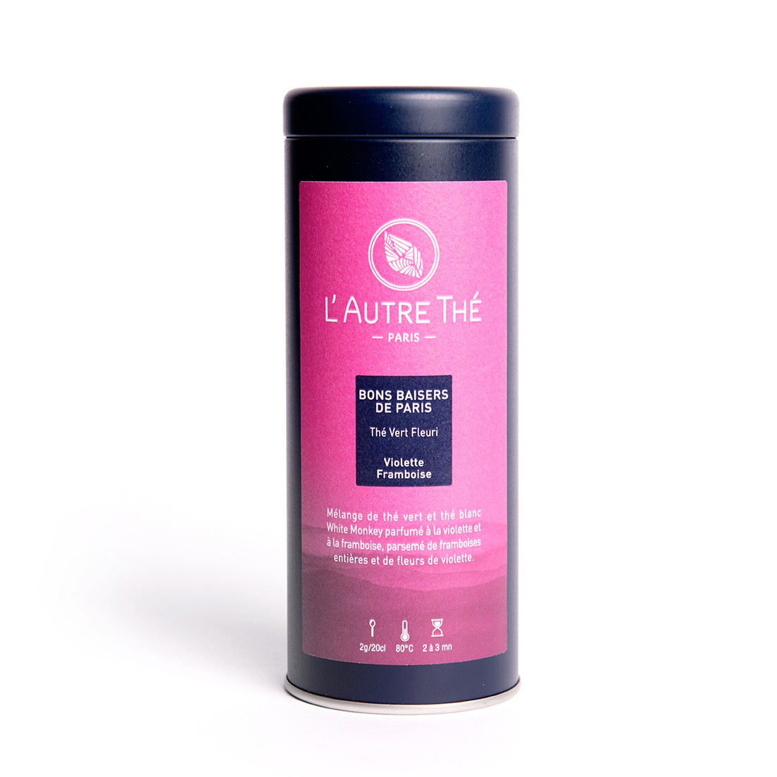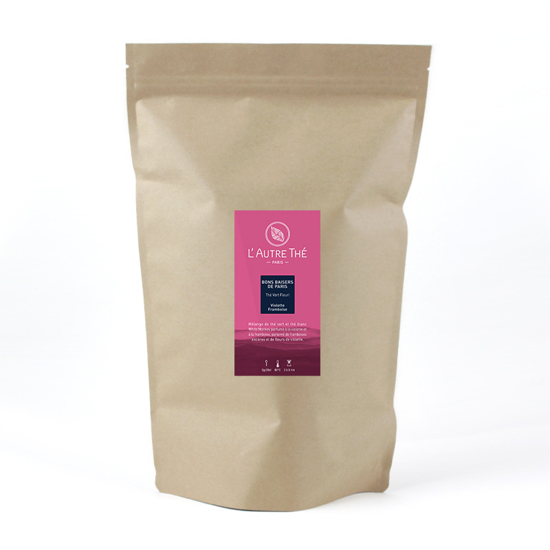 Ce mélange de thé vert et blanc White Monkey "Bons Baisers de Paris" est un thé original aux arômes de violette et framboise. Il est parsemé de framboises entières et de pétales de violette.