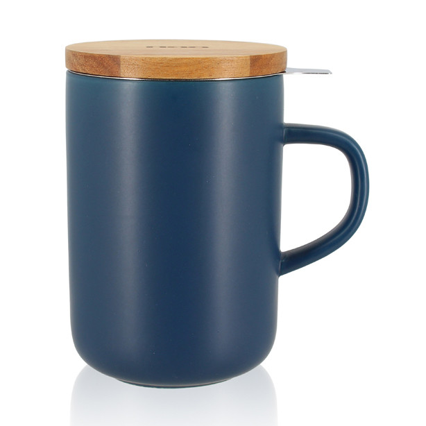 Tisanière en porcelaine bleue mat au design scandinave avec couvercle en bois. La marque est spécialisée dans les accessoires pour le thé afin de rendre meilleure l'expérience de dégustation grâce à des matériaux hauts de gamme et un design tendance et épuré.