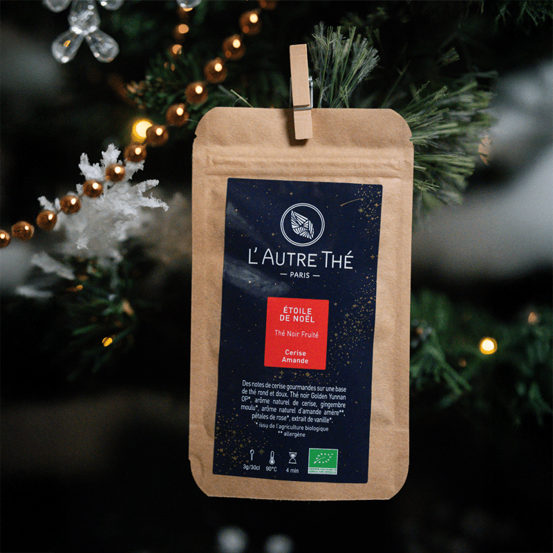 Étoile de Noël (organic): A delicate Golden Yunnan OP black tea, well-rounded, flavored with cherry and almond, with a hint of ginger.