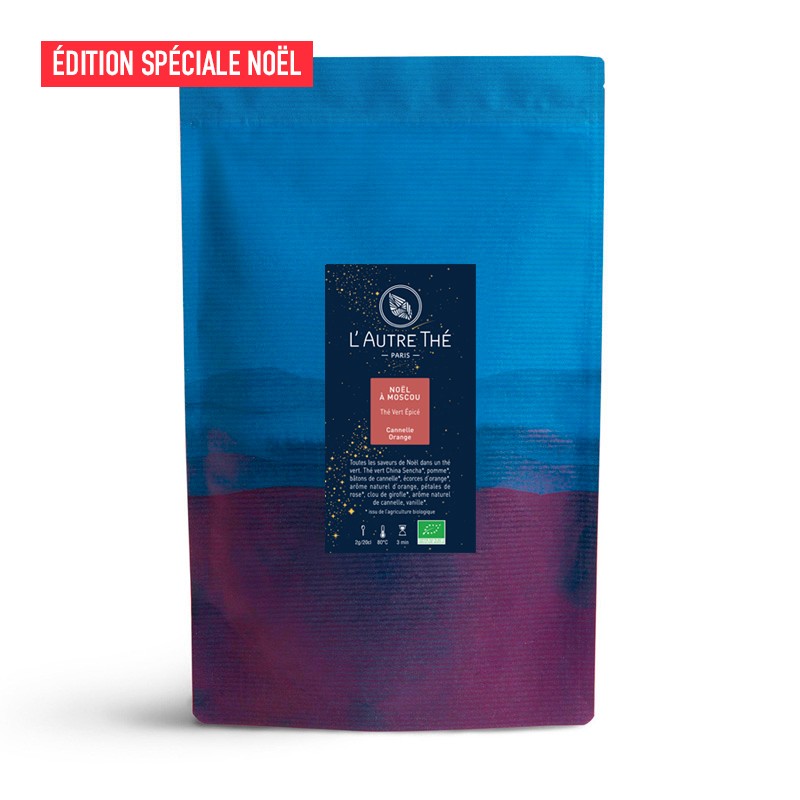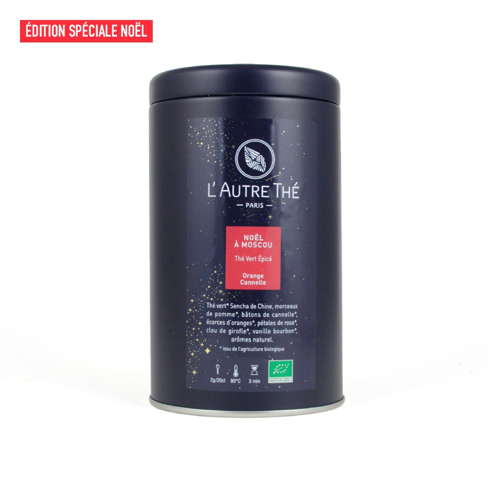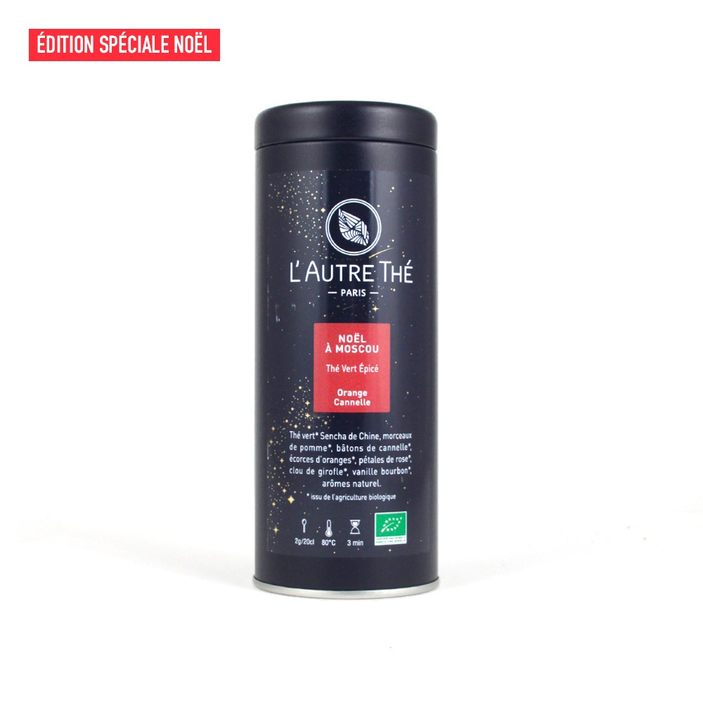 “Noël à Moscou” is an organic Sencha green tea from China with natural orange, vanilla and cinnamon flavors, topped with cinnamon sticks, orange peel and apple pieces, and sprinkled with cloves and rose petals.