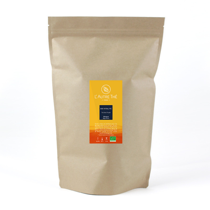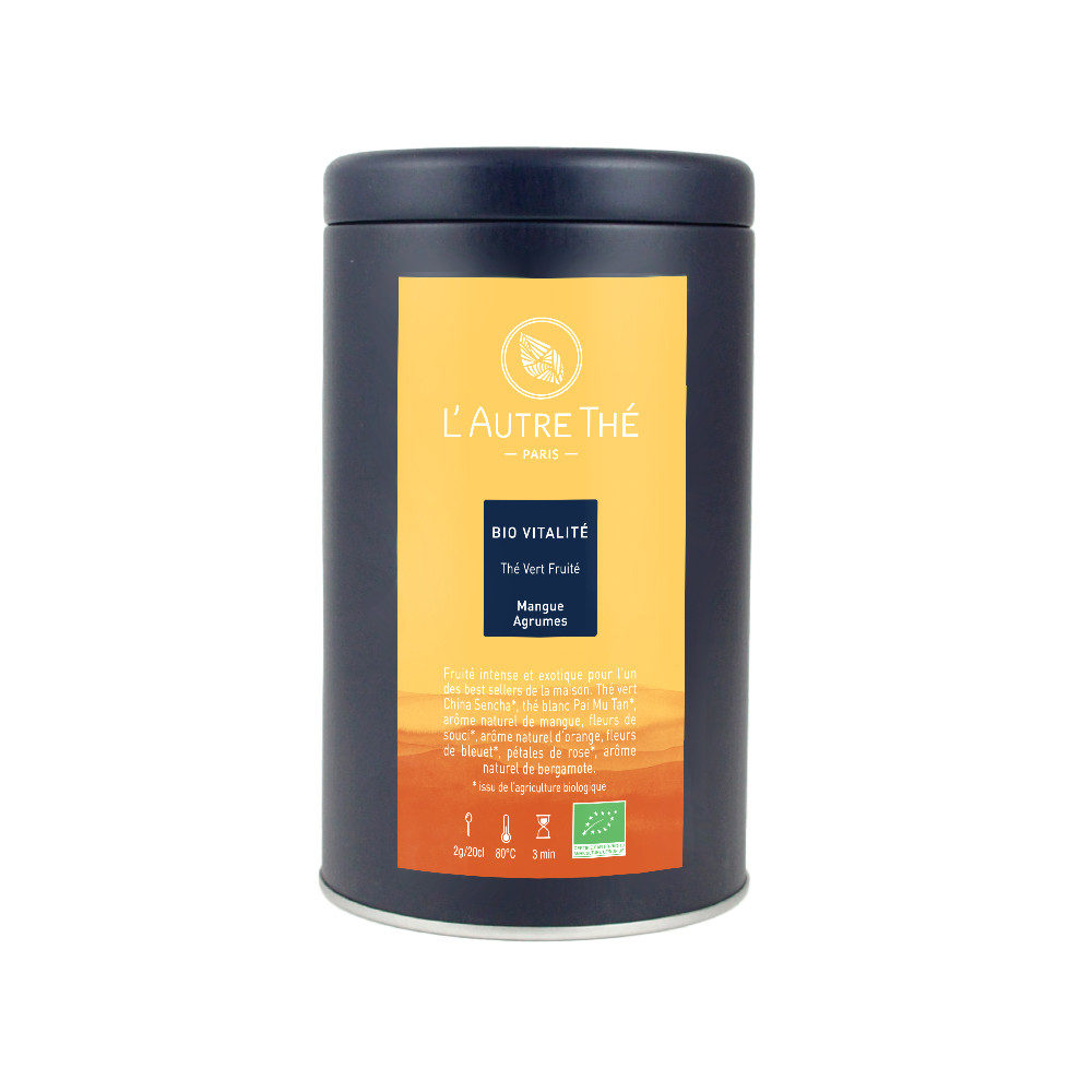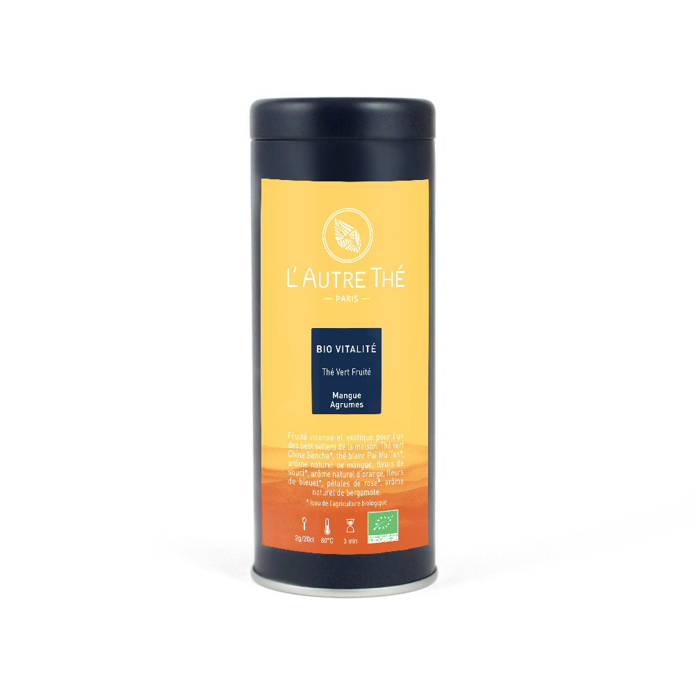 This "Bio Vitalité" organic Tea is a blend of Sencha green tea, Paï Mu Tan white tea, with citrus and mango natural aromas. It is sprinkled with rose and cornflower petals.