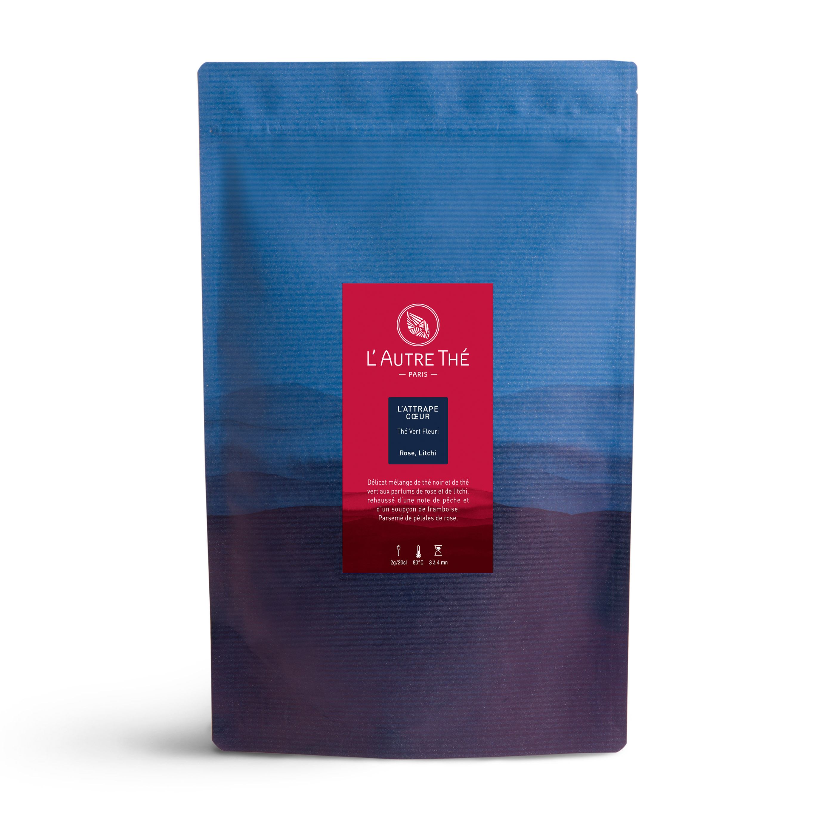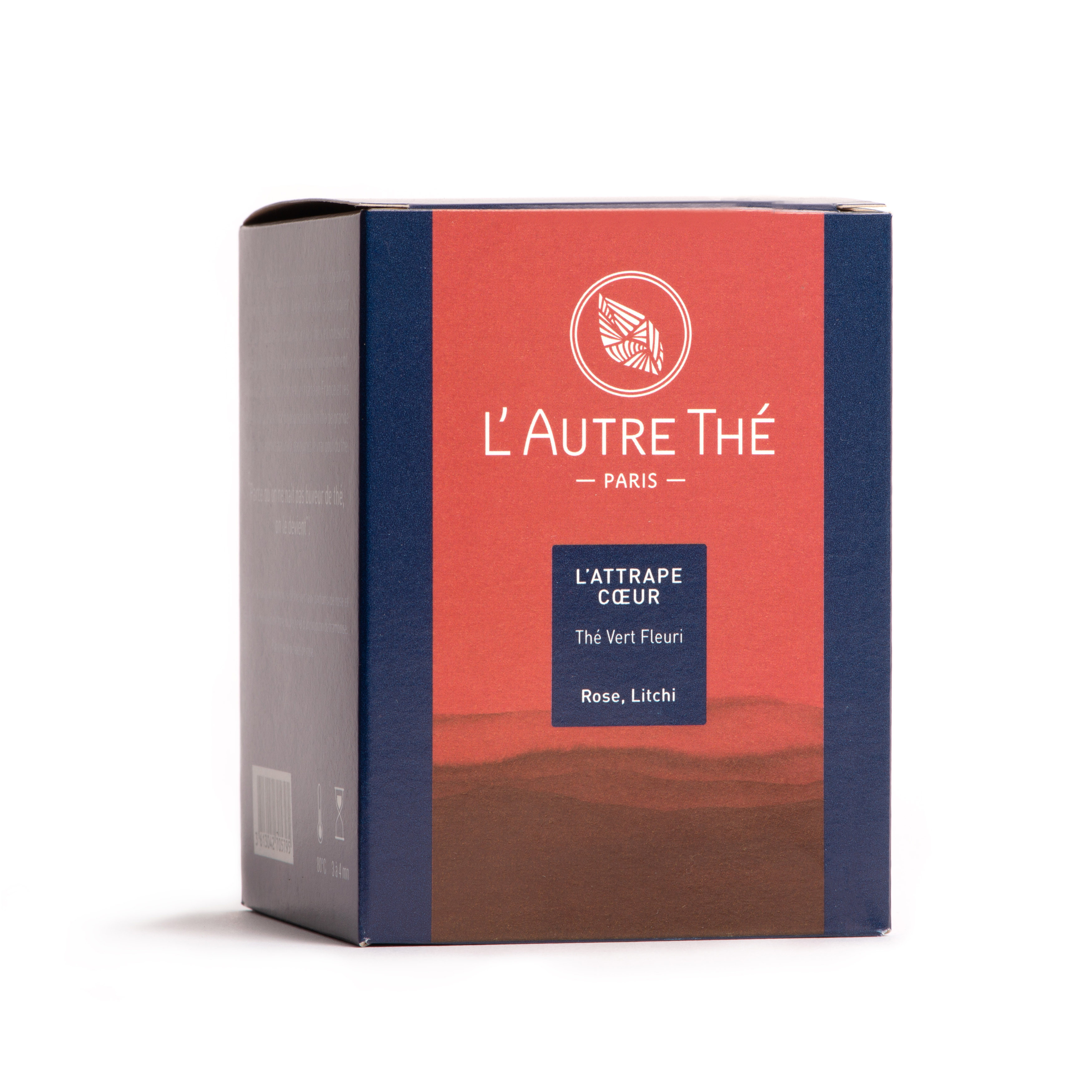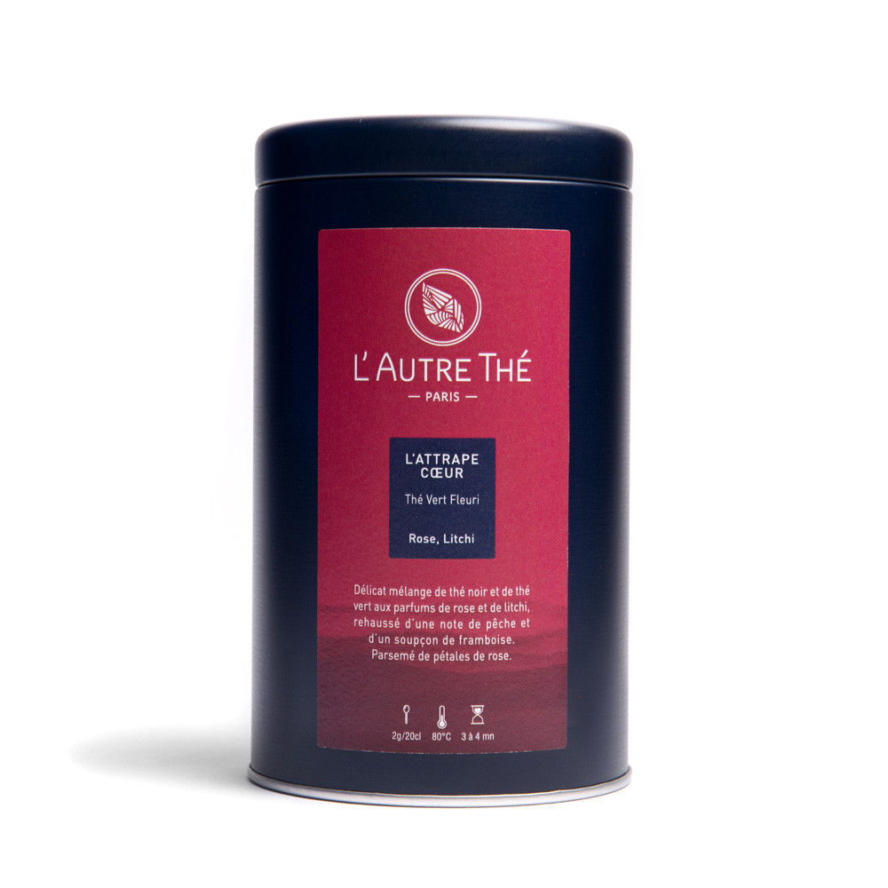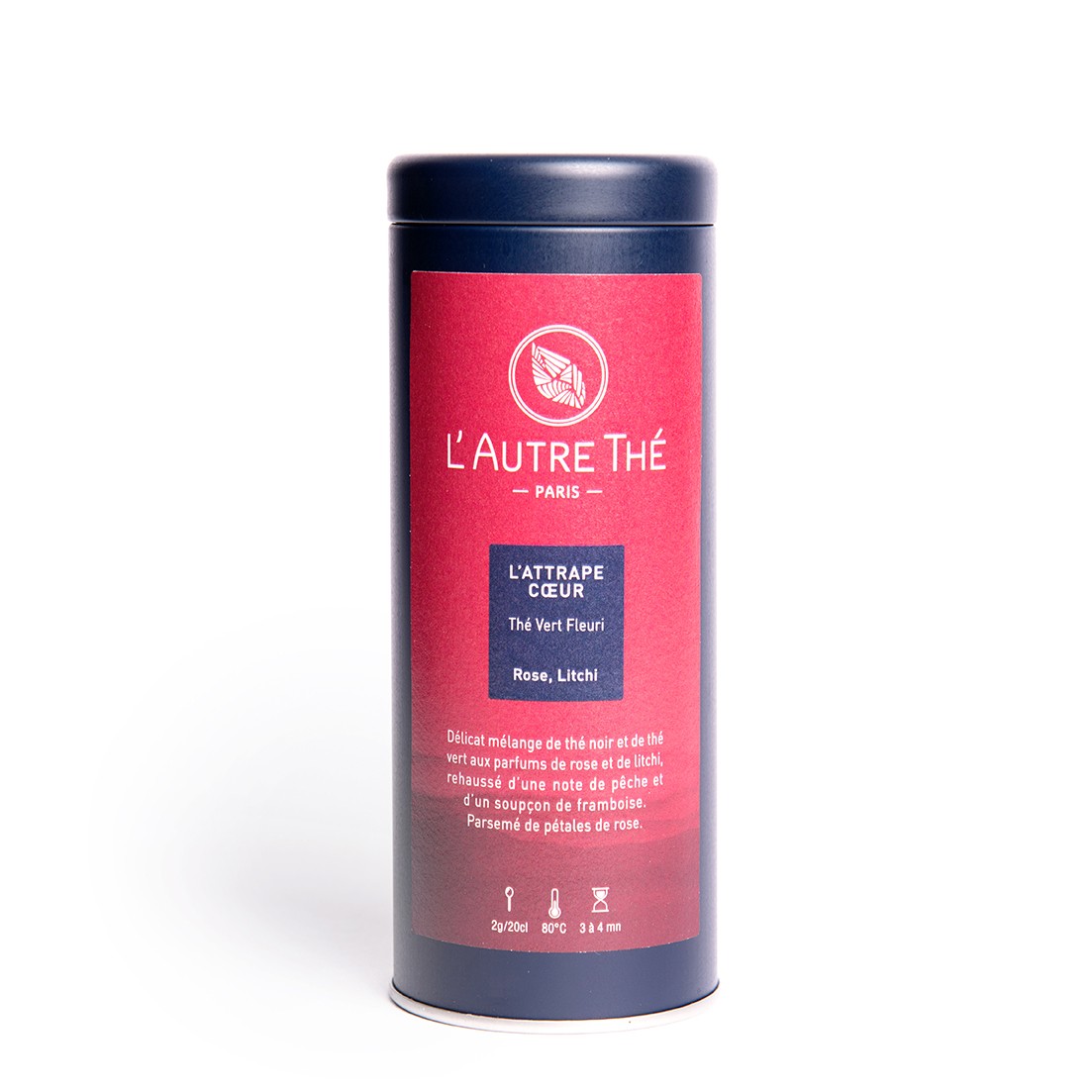 "The Heart Catcher" is a delicate blend of Sencha green tea and black Chinese tea with Lychee and Rose aromas, enhanced by a hint of Raspberry and Peach.