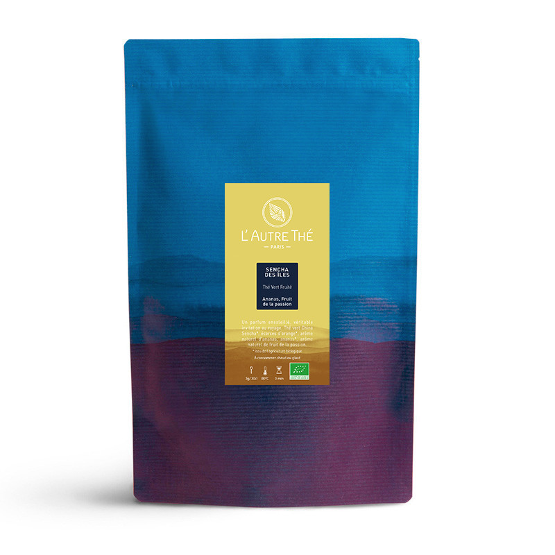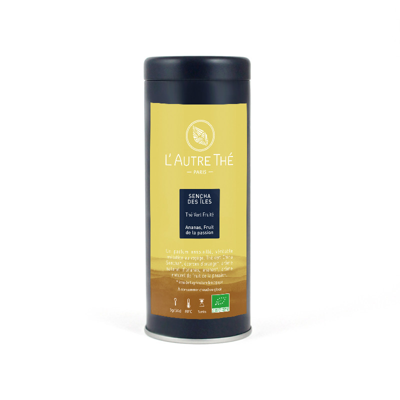 This green tea "Sencha des Iles" is a Chinese Sencha tea with flat leaves and orange peel.