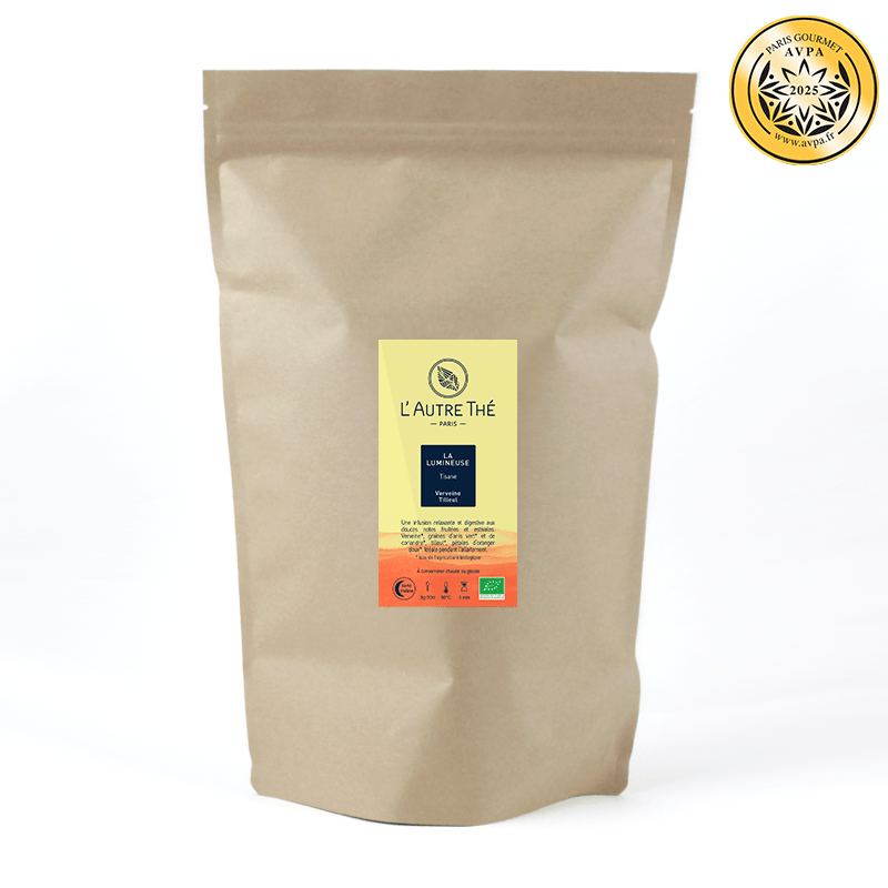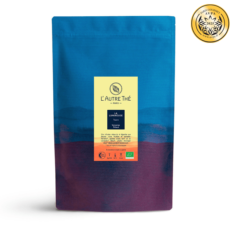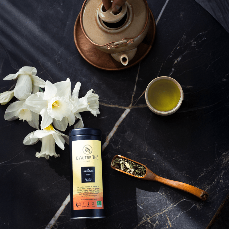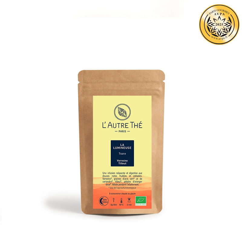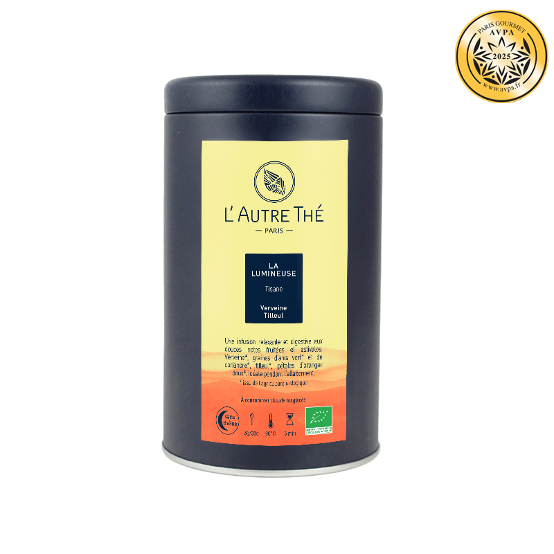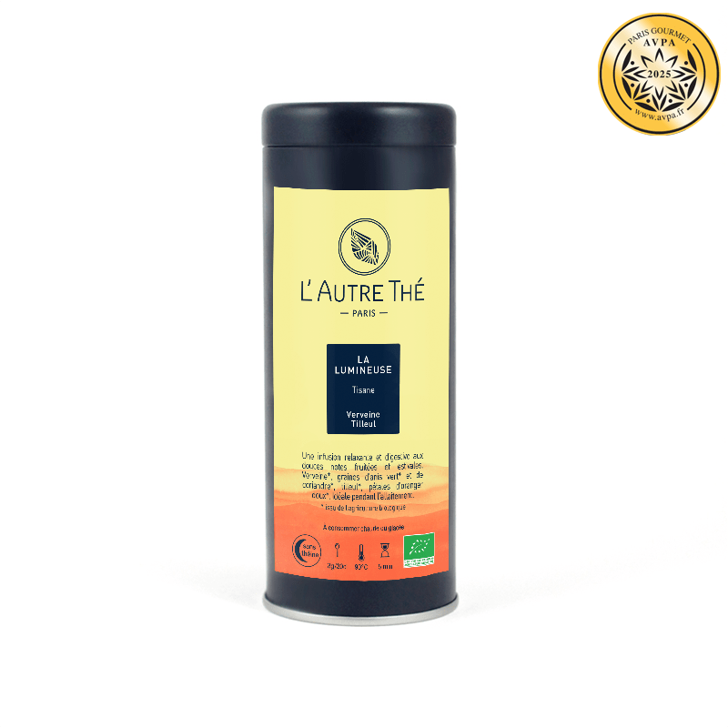Composed of verbena and linden, La Lumineuse is spiced up with anise and coriander seeds for a vegetal touch, and sweet orange petals for a fruity yet delicately flowery facet. This pleasantly balanced blend, of course caffeine-free, is ideal for relaxation and digestion.