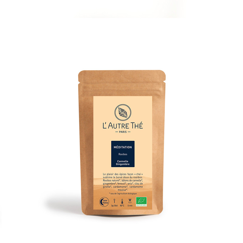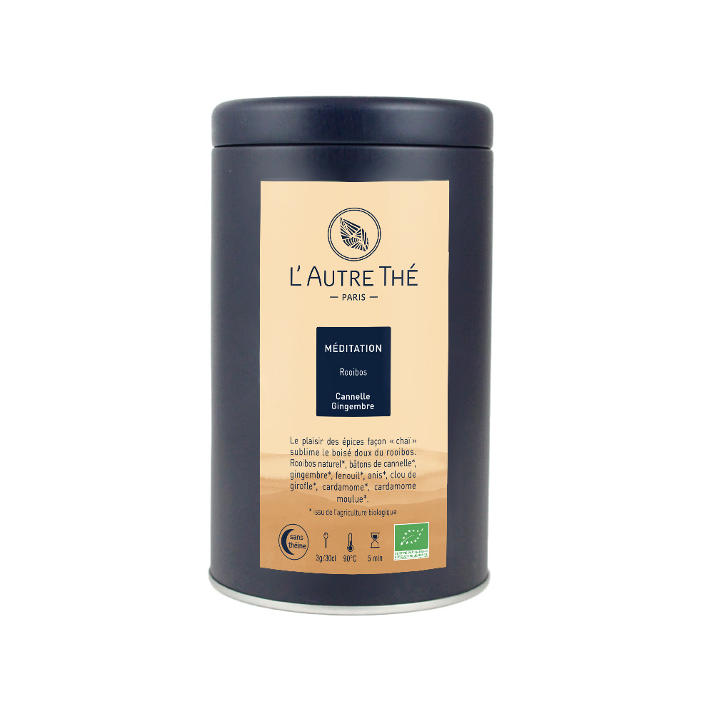 The organic southafrican rooïbos « Méditation » tea (or red tea) contains cinnamon , ginger, fennel, anise, cloves pieces and full cardamom. Most of the ingredients which compose this blend are well-known for their relaxing properties: calming rooïbos, comforting cinnamon, stimulating cloves and calming cardamom. This rooïbos is slightly spicy, comforting and delightfully warm.