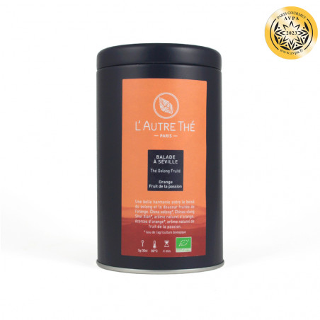 Ce mélange raffiné de deux thés oolong bio est parfumé à l'orange et au fruit de la passion ; il est parsemé d'écorces d'orange.